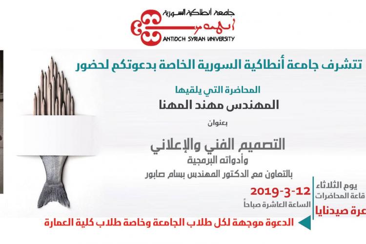 تتشرف جامعة أنطاكية السورية الخاصة بدعوتكم لحضور المحاضرة التي يلقيها المهندس مهند المهنا بعنوان: التصميم الفني والإعلاني وأدواته البرمجية بالتعاون مع الدك